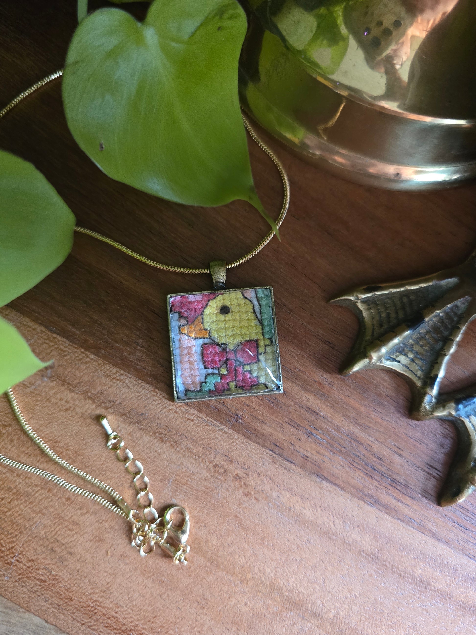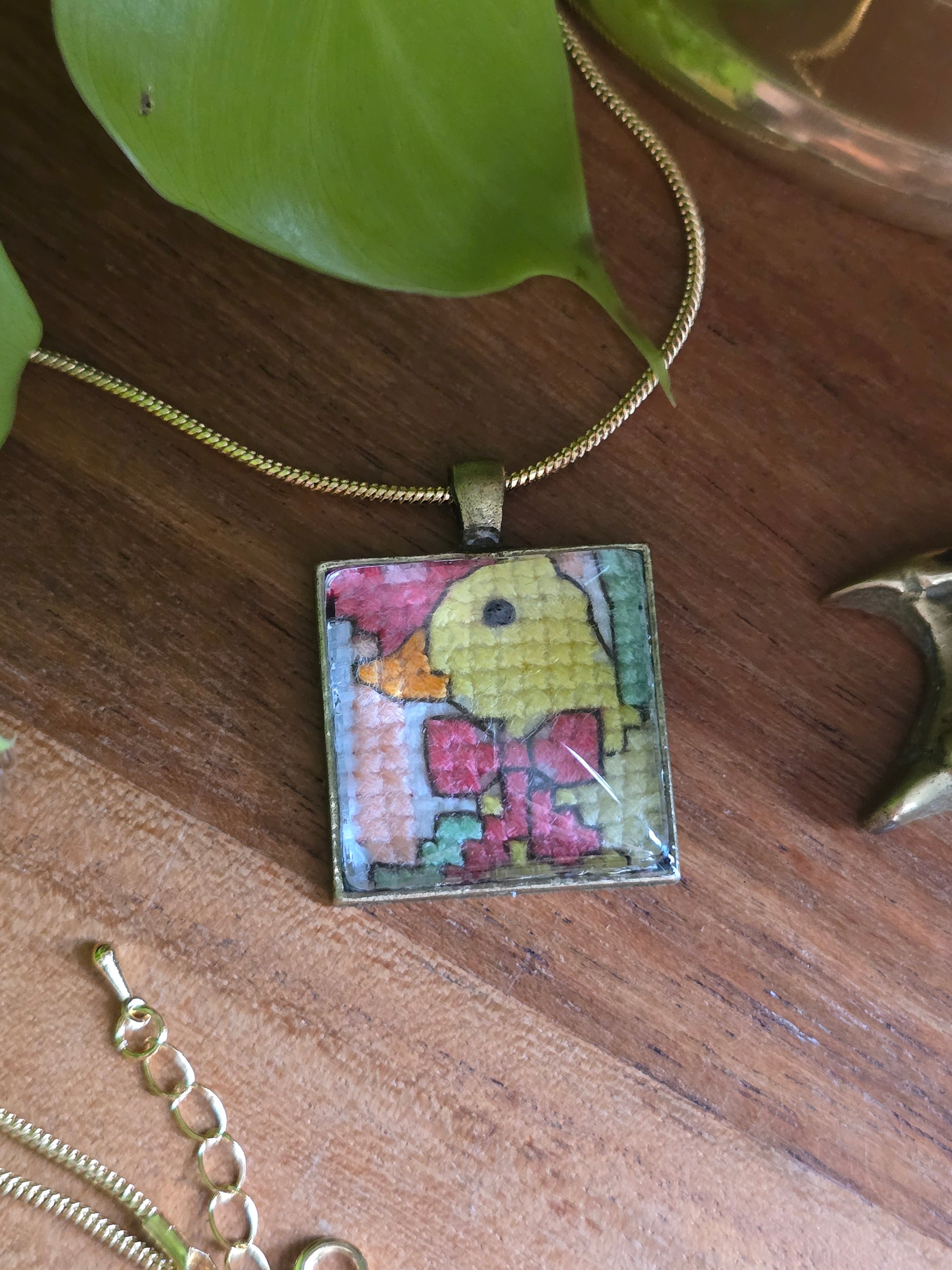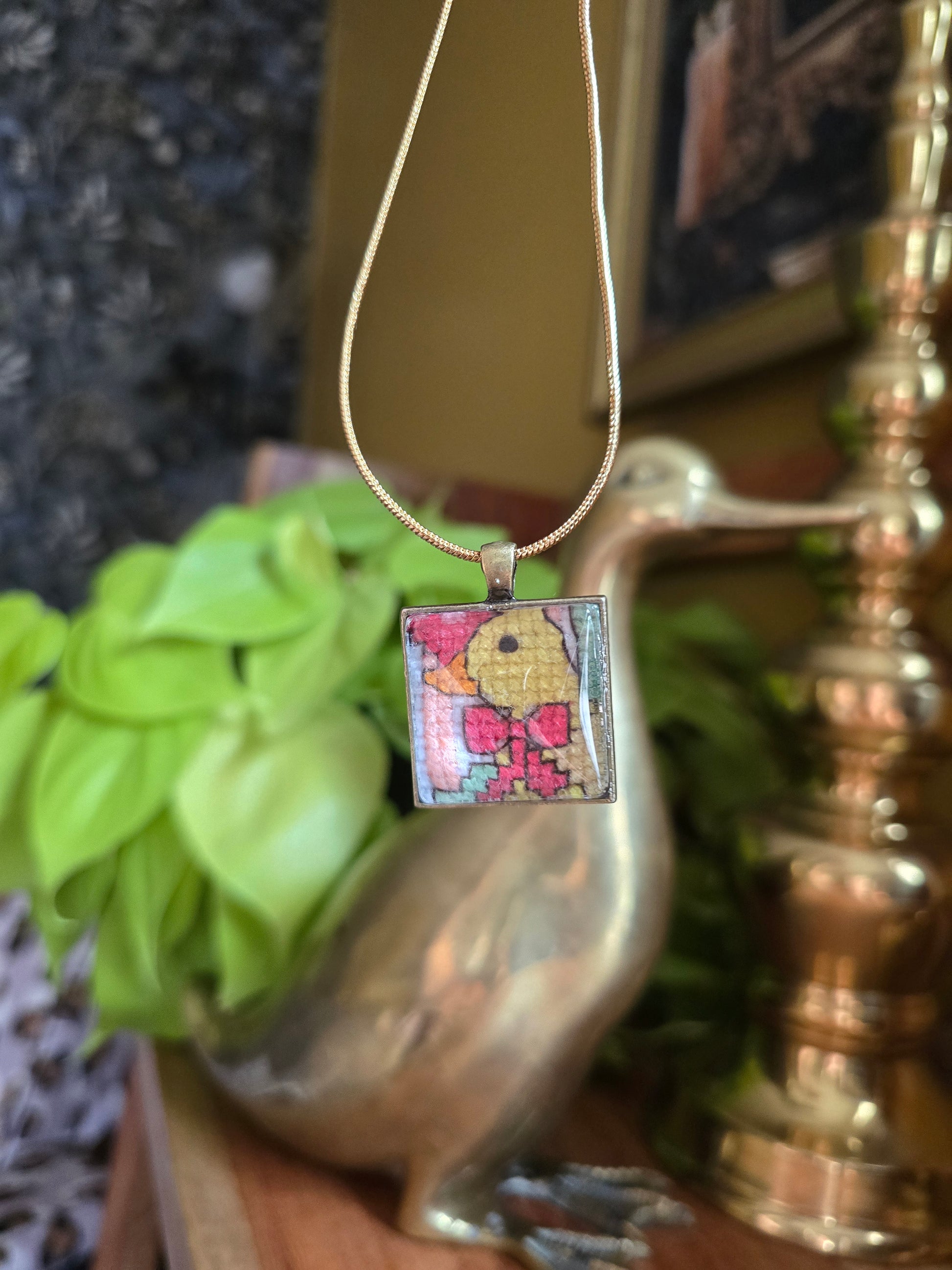 Each pendant in this collection began as a rescued vintage cross-stitch, carefully cut, sealed, and set into a metal frame to give it a brand-new life. What was once tucked away and forgotten has been transformed into a one-of-a-kind wearable story — no two are exactly alike.