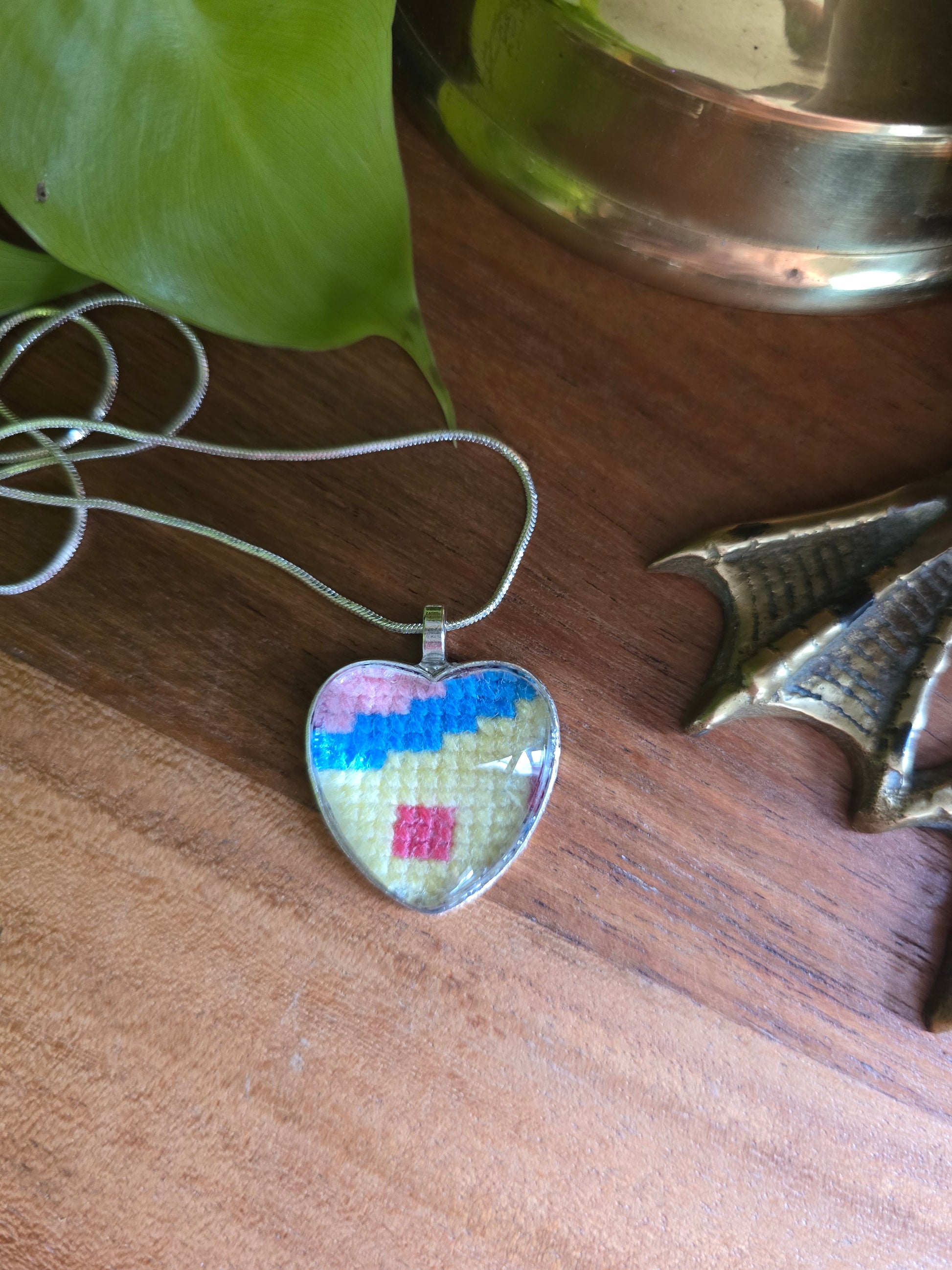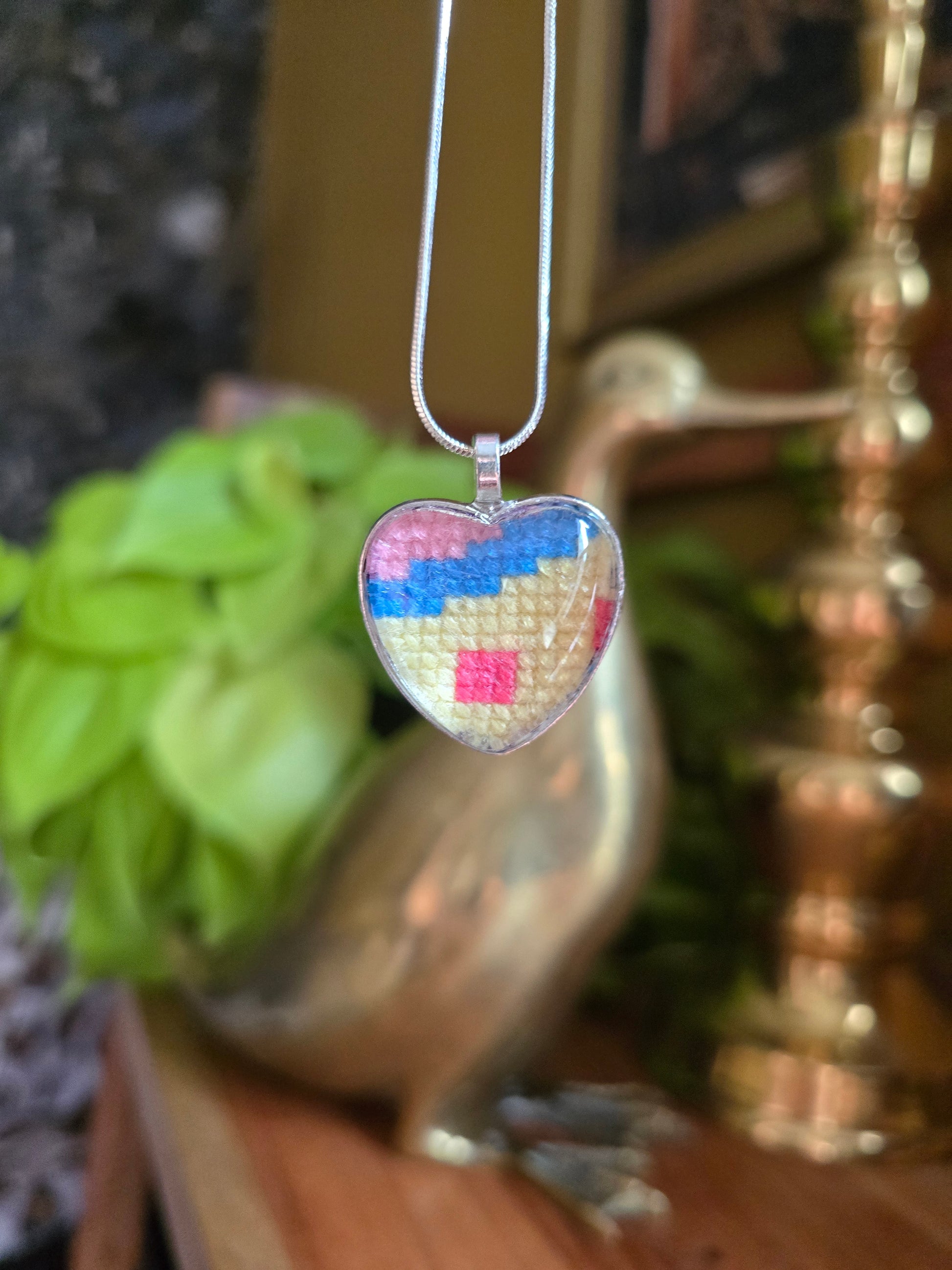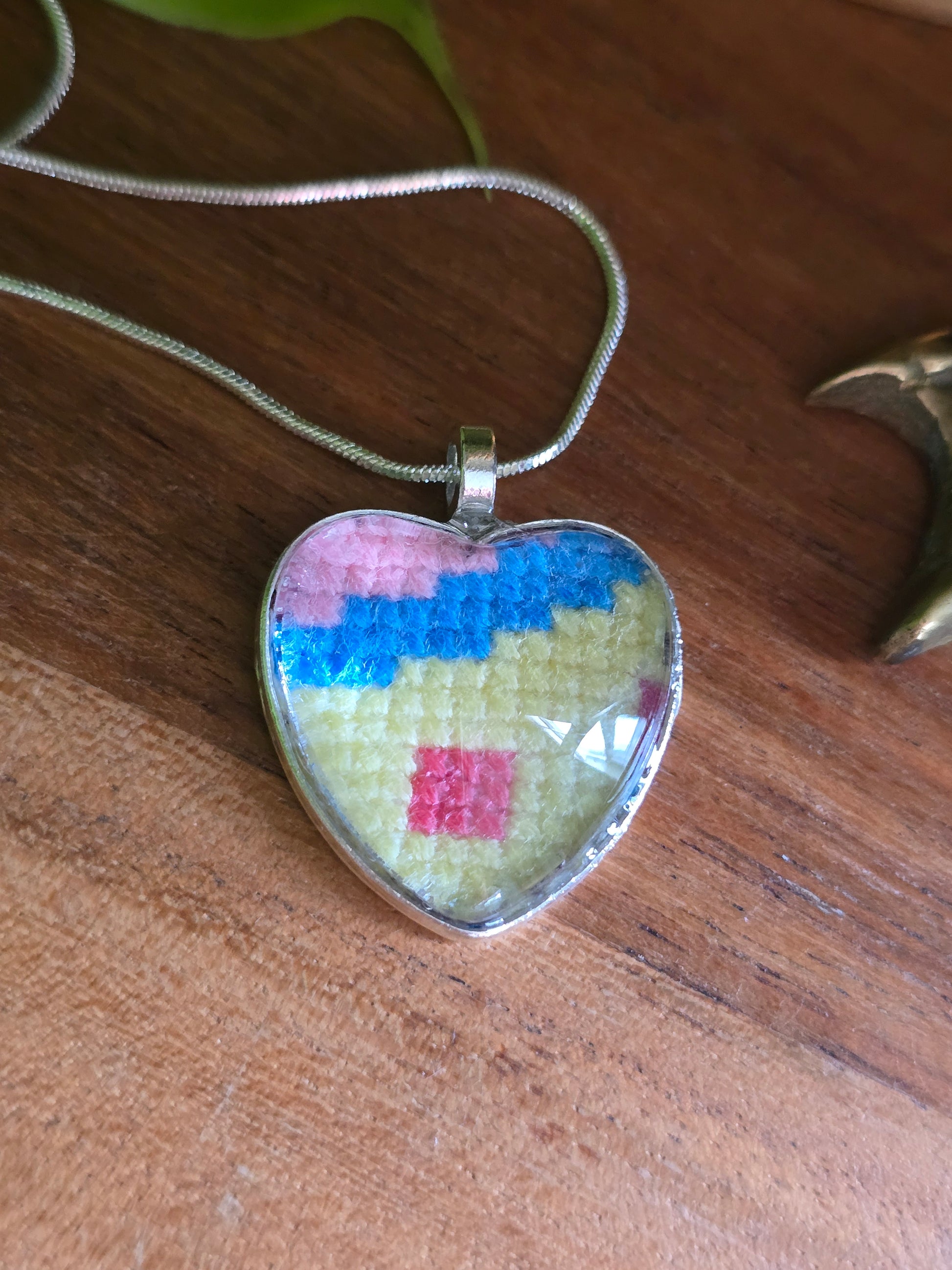 Each pendant in this collection began as a rescued vintage cross-stitch, carefully cut, sealed, and set into a metal frame to give it a brand-new life. What was once tucked away and forgotten has been transformed into a one-of-a-kind wearable story — no two are exactly alike.