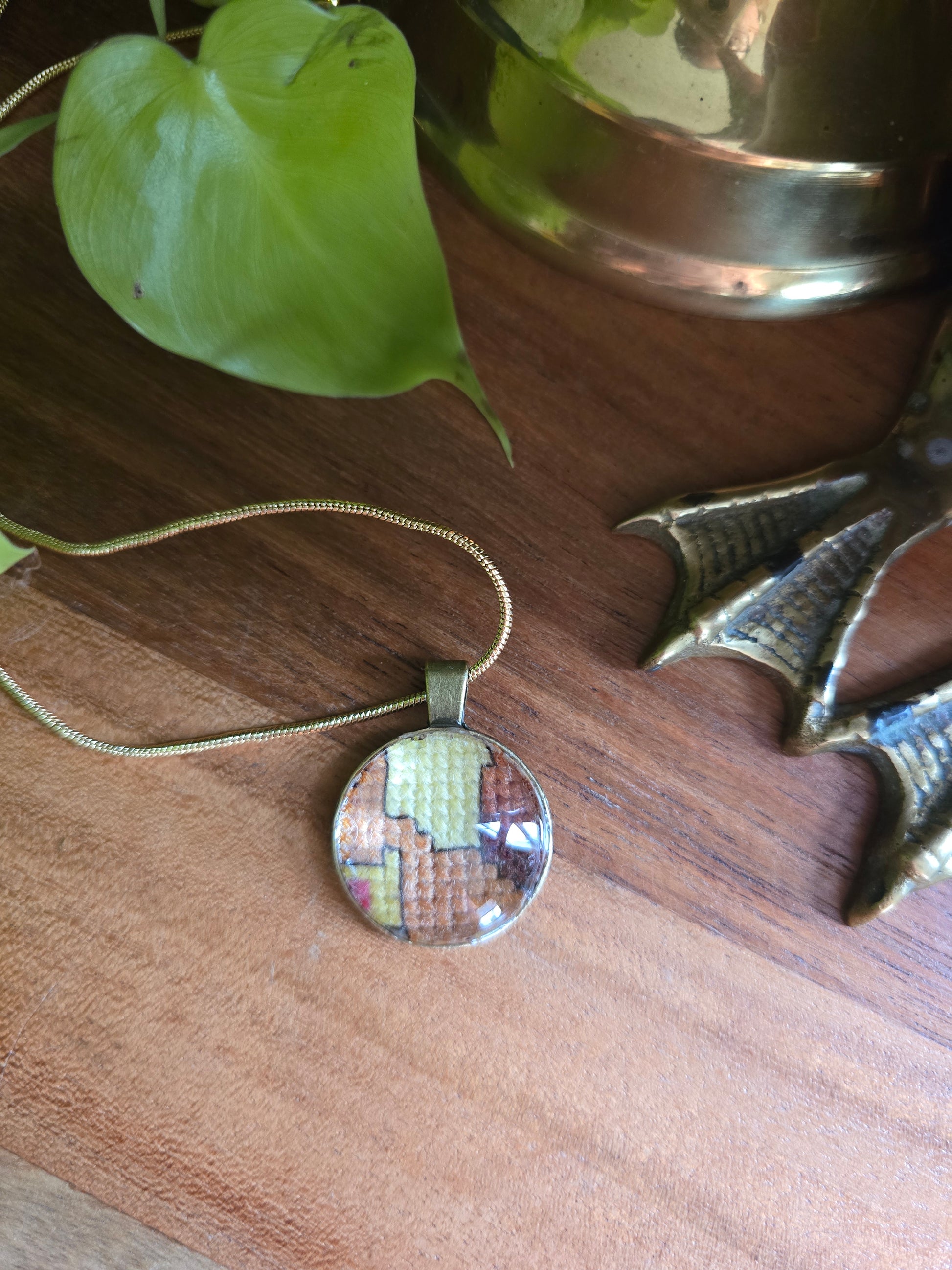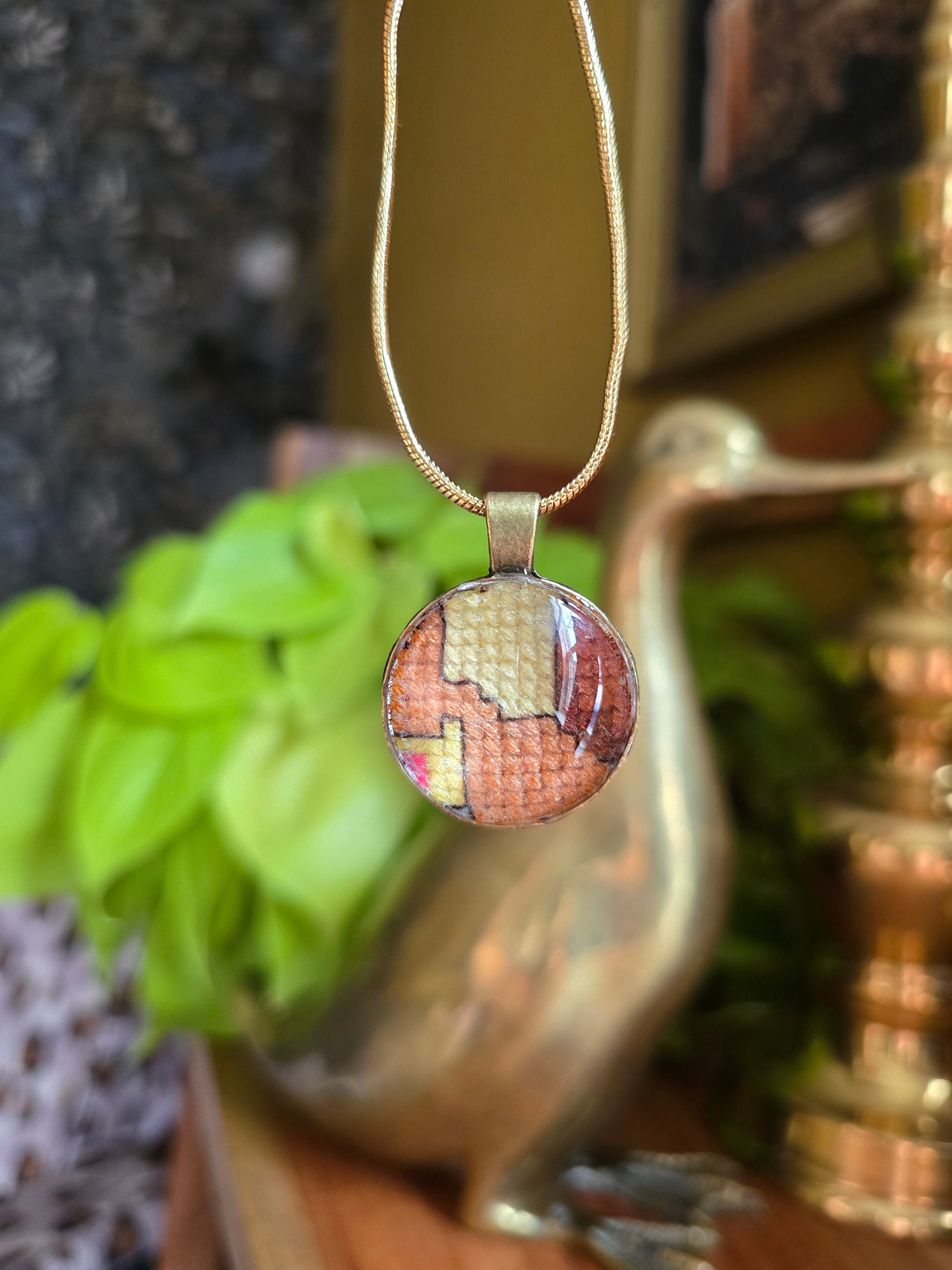Each pendant in this collection began as a rescued vintage cross-stitch, carefully cut, sealed, and set into a metal frame to give it a brand-new life. What was once tucked away and forgotten has been transformed into a one-of-a-kind wearable story — no two are exactly alike.